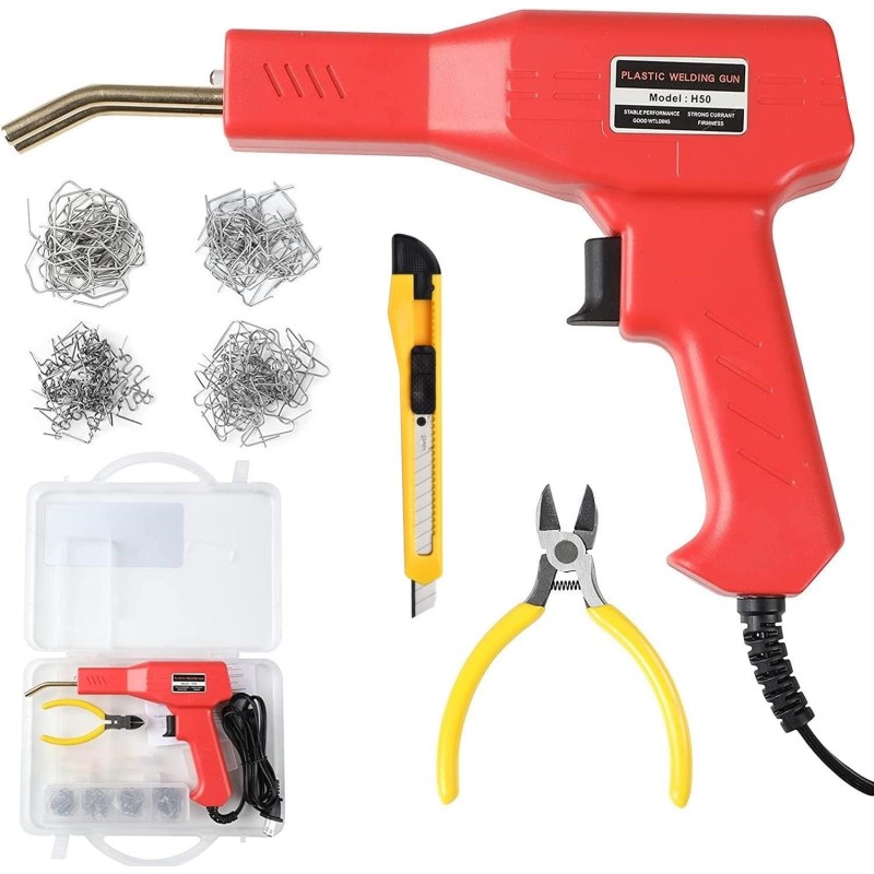 Ръчен телбод за пластмаса в комплект със скоби за вграждане и ремонт на счупени пластмасови елементи.