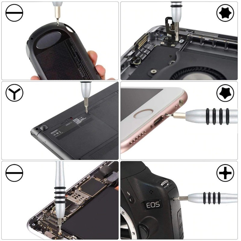 Комплект отвертки за обслужване и ремонт на таблети, лаптопи, игрови конзоли и много други артикули. Колекция от отвертки, опаковани в удобен калъф за лесно съхранение и транспортиране. Сменяеми накрайници с различни размери и форми, които могат да се монтират на универсален държач, ще спестят място в работилницата и вашата кутия с инструменти. Комплектът може да се използва за ремонт на почти всяко устройство - той е основен инструмент във всеки дом.