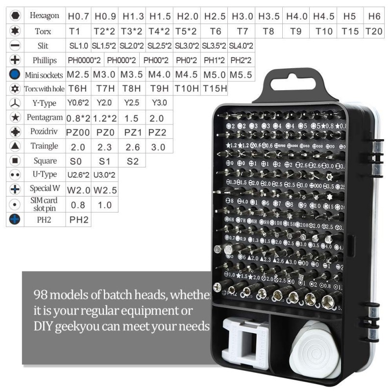 Комплект инструменти за ремонт на лаптопи и телефони с всички необходимо инструменти. Комплект прецизни отвертки с магнитни накрайници за широк спектър от приложения. Позволява ви сами да извършвате дребни сервизни ремонти. Обширен набор от прецизни инструменти - цели 115 елемента, 98 отвертки и много други инструменти за професионални ремонти.