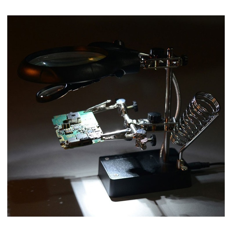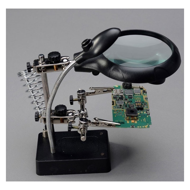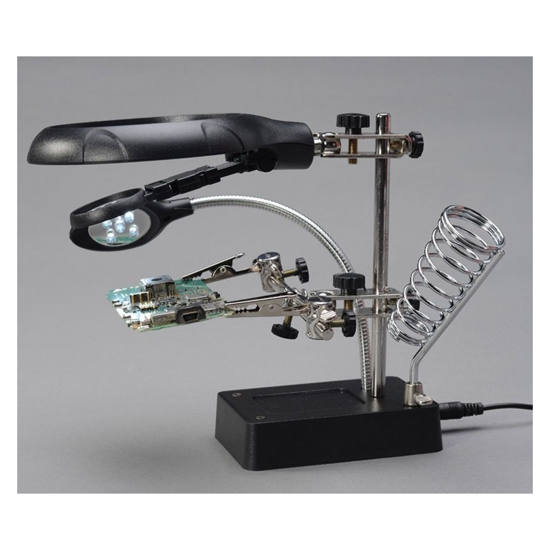 Трета ръка с лампа, лупа, поставка за поялник и стабилна основа