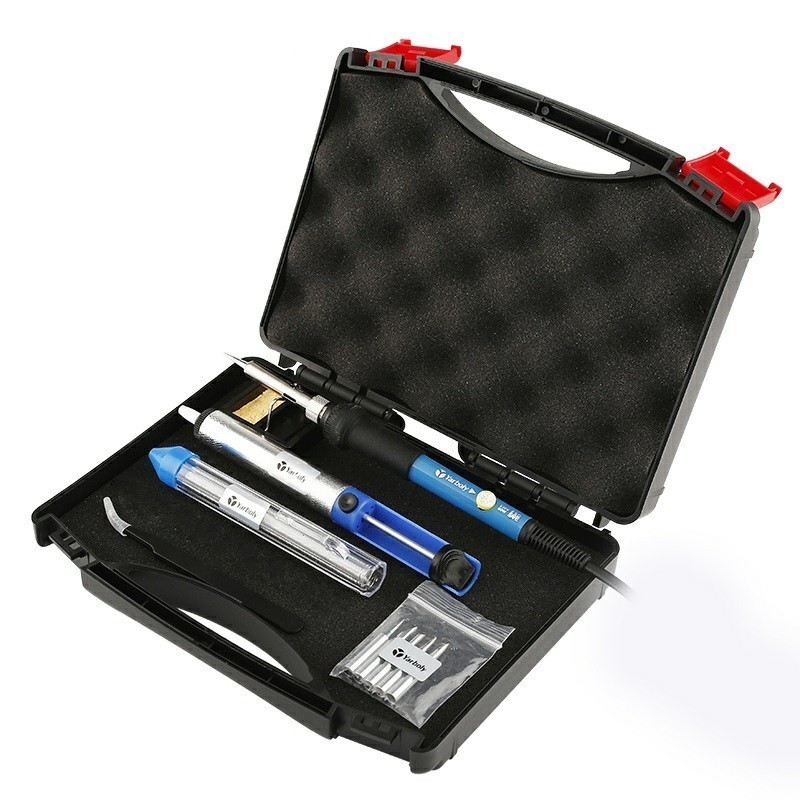Комплектът включва електрически поялник, 5 броя човки, стойка, почистваща гъба и вакуумна помпа за калай. С антистатичните пинсети и припоя, можете да извършвате прецизни дейности и да запоите различни компоненти с лекота.