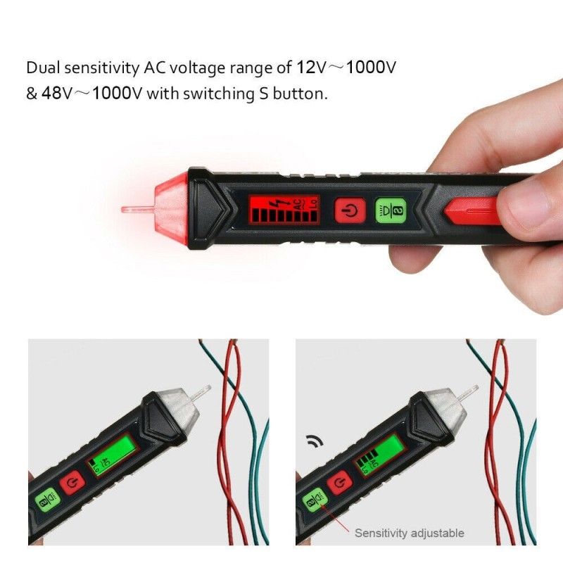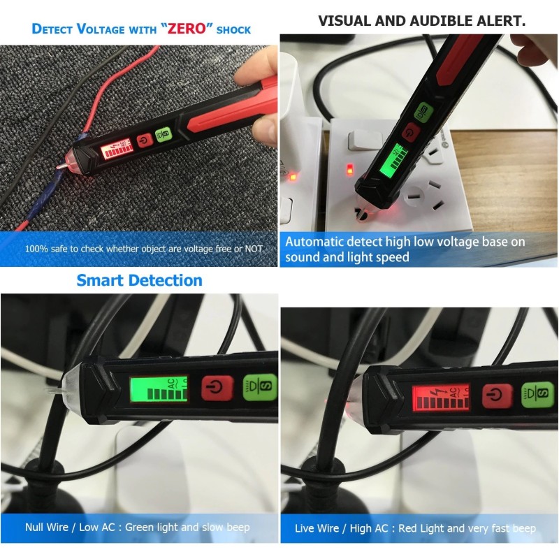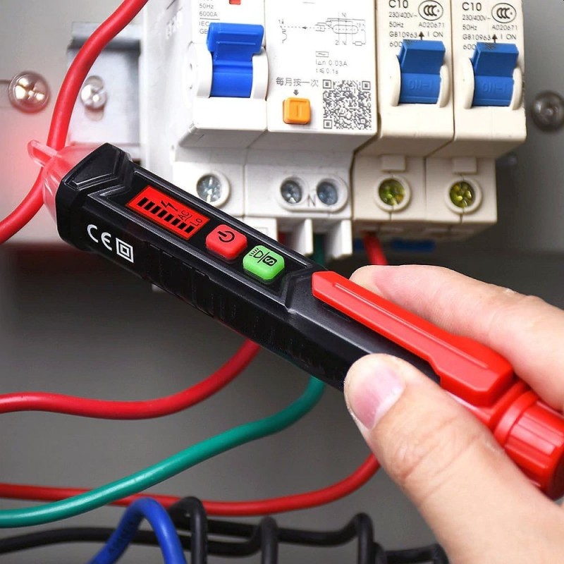 С помощта на оптичния и акустичен сигнал, този безконтактен тестер за напрежение предоставя първоначална информация дали компонентът е под напрежение. Той е снабден с LED екран, който свети в зелено при нормални стойности и в червено при високи, като също така има и звукова индикация. Това позволява на потребителя да открива проблемни кабели в стени и да разпознава фазата от нулата, без да е необходимо да обелва кабела, както при обикновените фазомери.