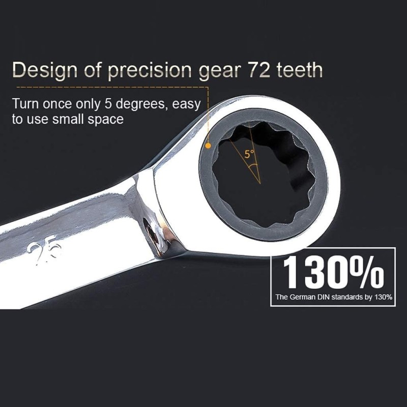 Главата на ключа е с наклон 15°, което го прави изключително удобен за работа на труднодостъпни места. Той е изцяло полиран за по-голям комфорт и ефективност при работа. Освен това, този ключ позволява реверсивен ъгъл на рамото от 5°, което допринася за по-лесното и плавно въртене.