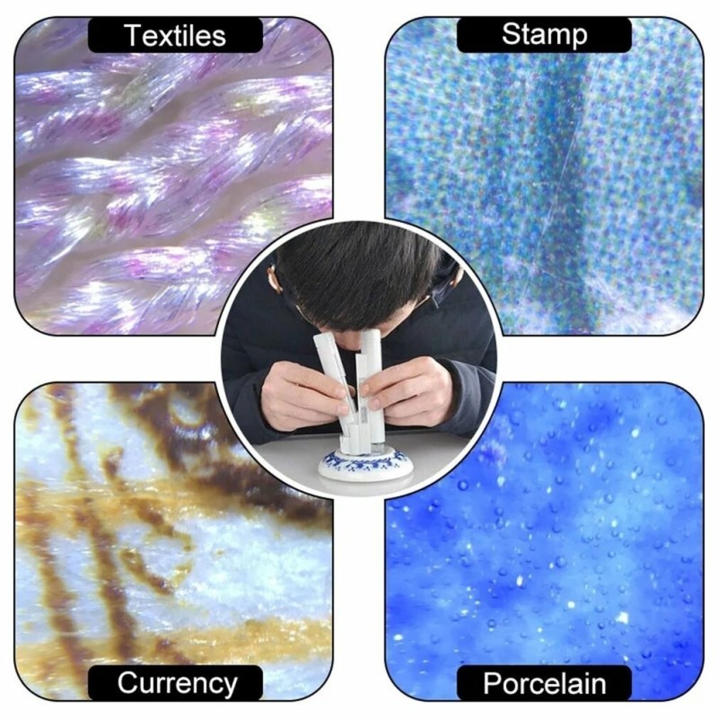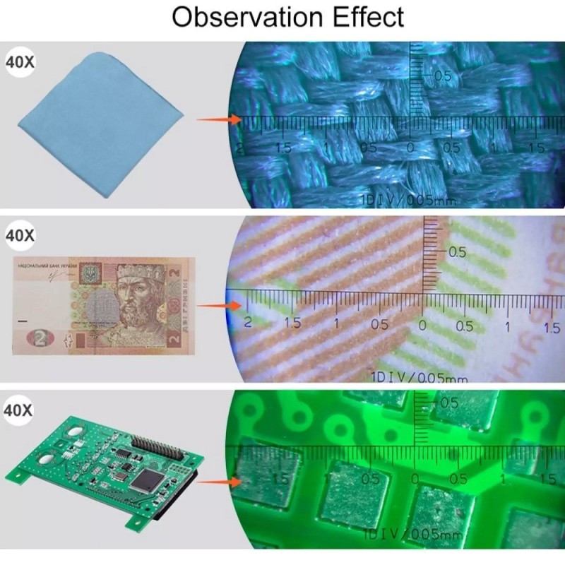 С помощта на този микроскоп можете да изследвате различни области на науката, включително химия и физика. Виждането на пикселите на телефона, монитора или телевизора става възможно благодарение на отделната им подсветка в зелен, син и червен цвят. Този микроскоп е идеален за проверка на пари и ви позволява да се потопите в огромната вселена на микро-света.