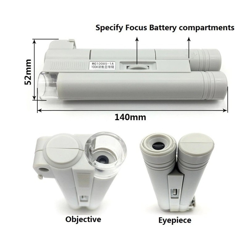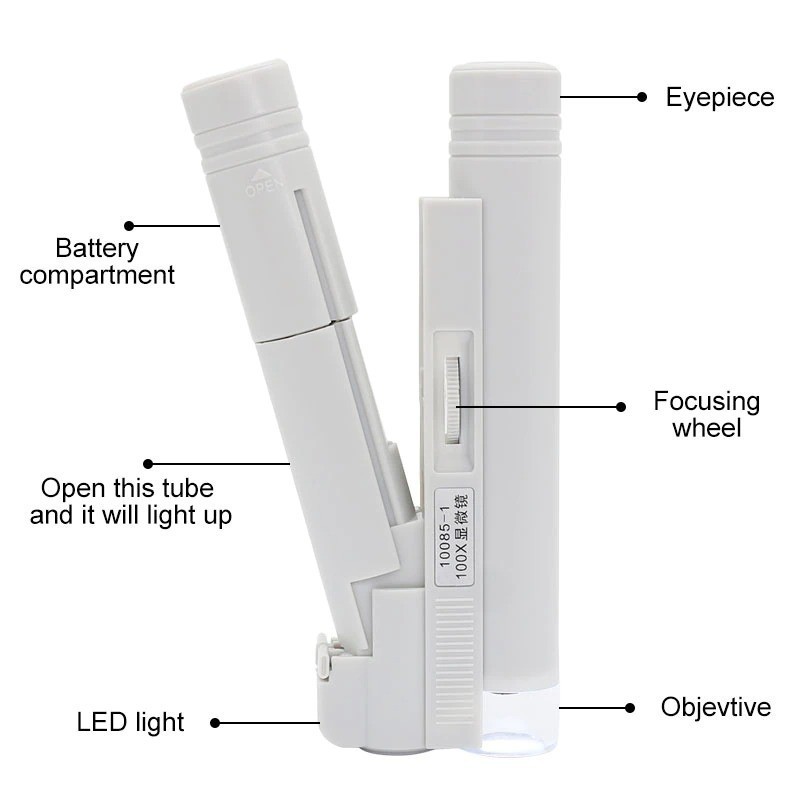 Имаме удоволствието да ви представим 100X Преносим Микроскоп - идеалният инструмент за всеки научен маняк и любител на микро-света. Този джобен микроскоп е снабден с LED подсветка и разполага с увеличение 100х, което ви позволява да разглеждате микроскопичните детайли с изключителна яснота и прецизност.