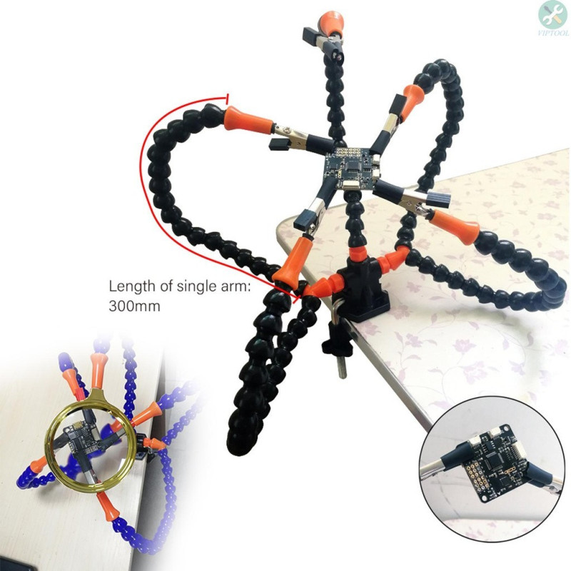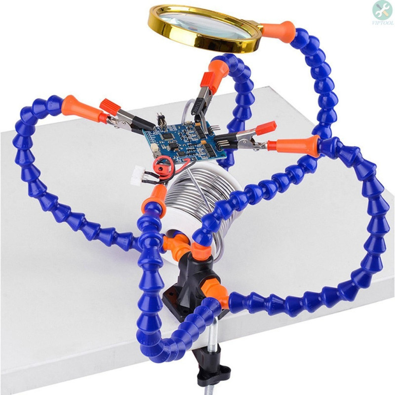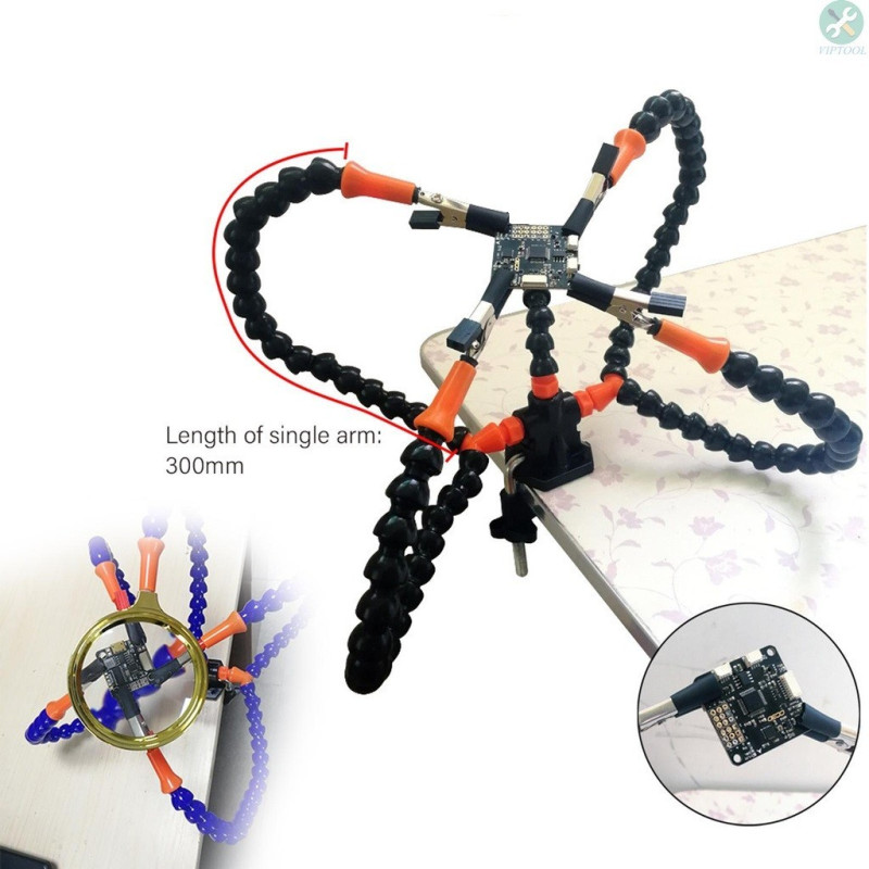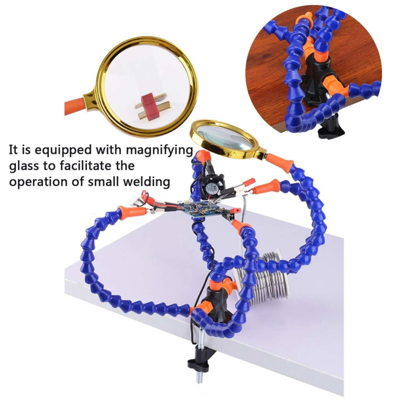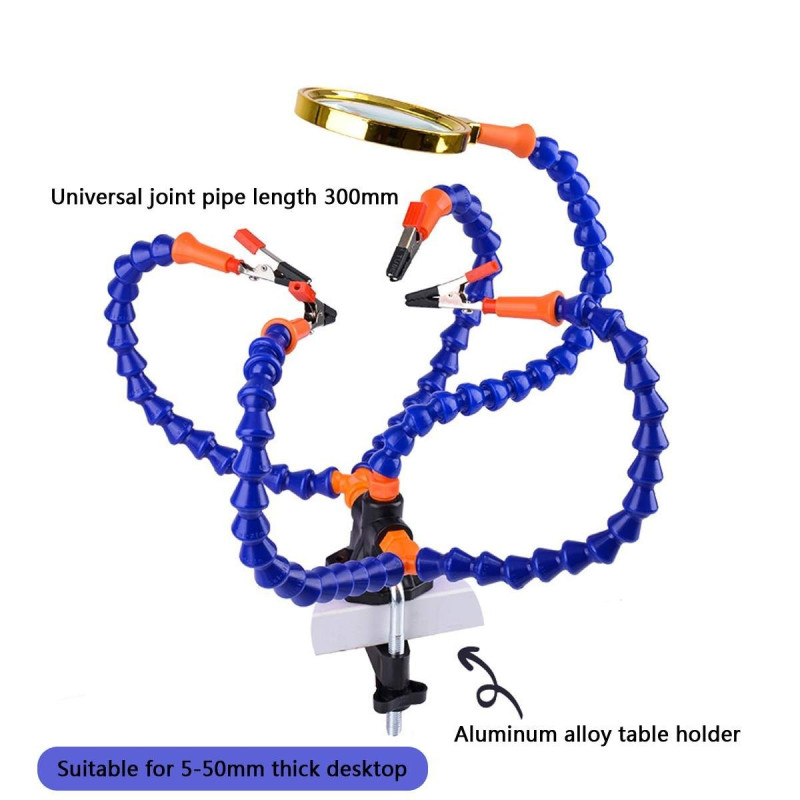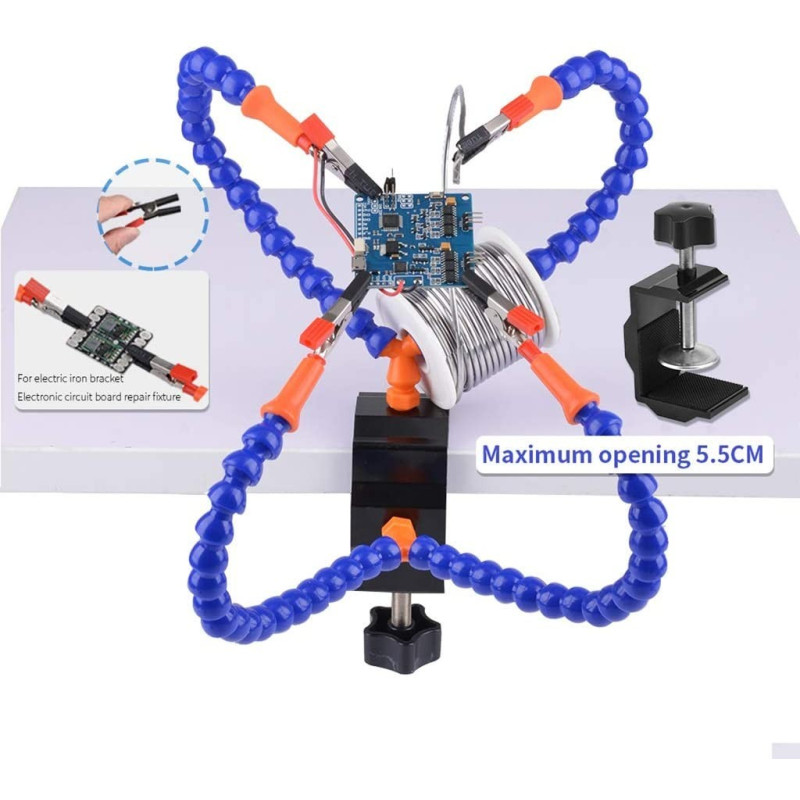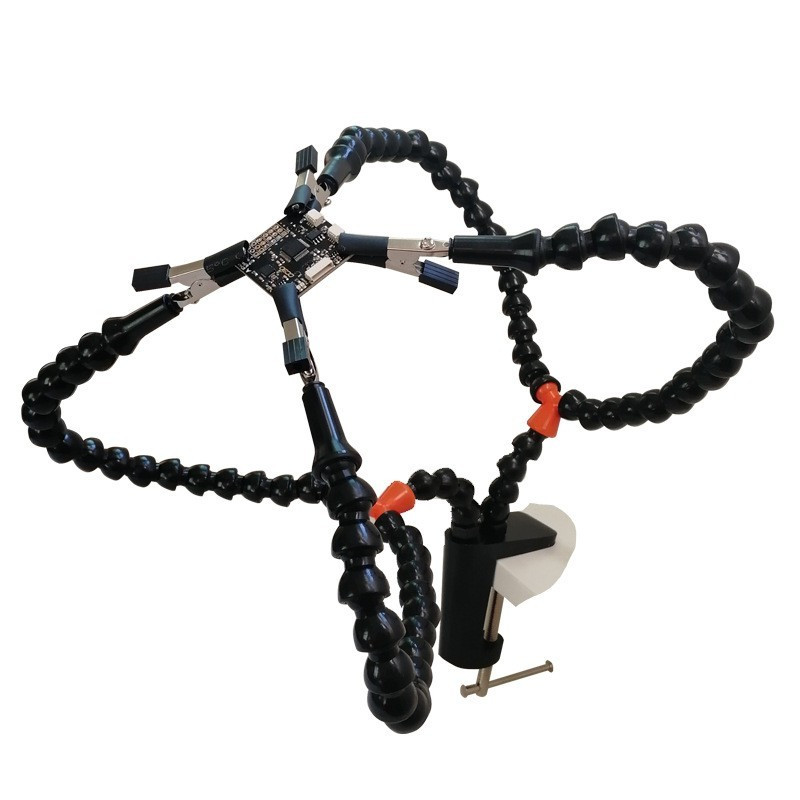Стойката за запояване-Трета ръка е перфектното решение за всички, които се занимават с електроника и ръчни занаяти. Тя е снабдена с четири подвижни рамена и 4 скоби тип алигатор, което позволява да държите и фиксирате вашите проекти и компоненти по време на работа.