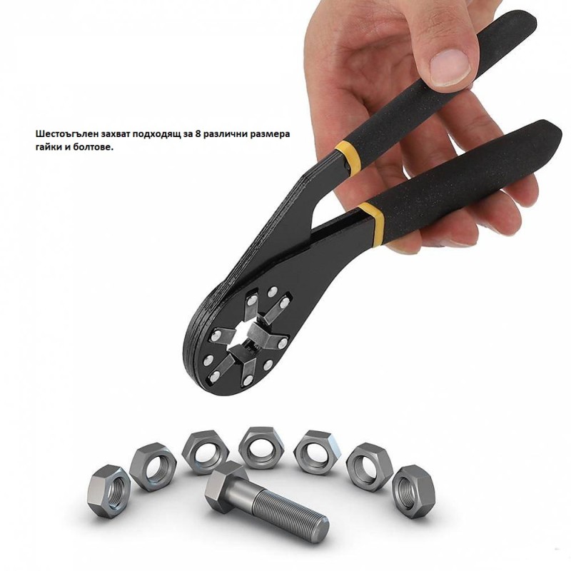 Универсален гаечен ключ във формата на шестоъгълни регулируеми клещи, с помощта на които може да отвивате и завивате различни по големина винтове, болтове и гайки много лесно.