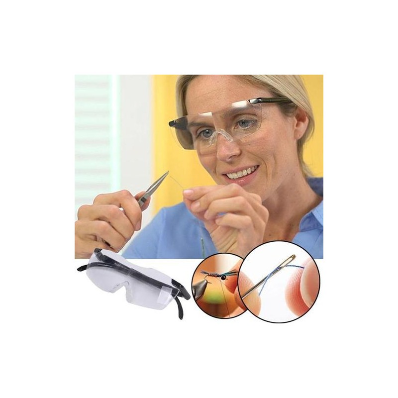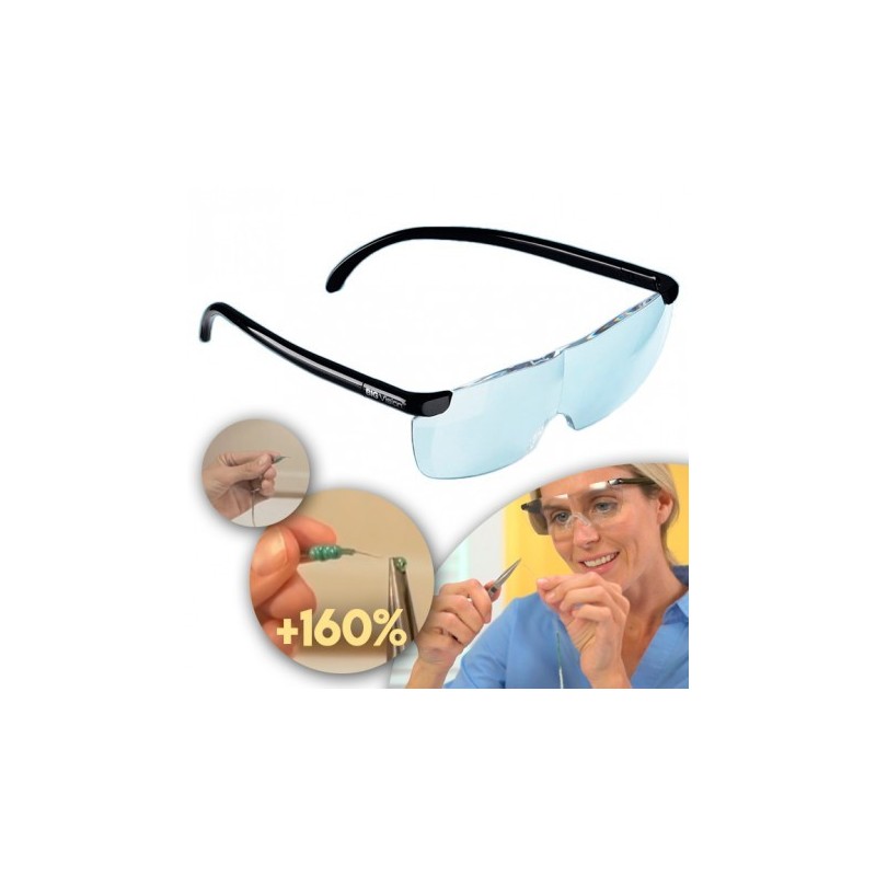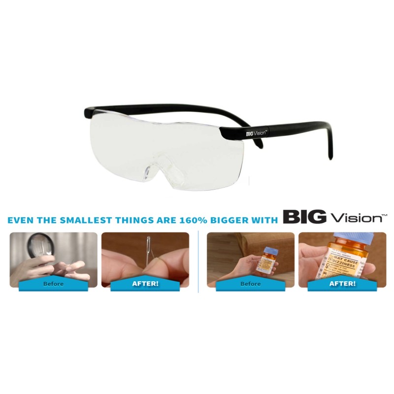 Увеличителни очила за ремонтиране, шиене и боравене с дребни детайли. Вижте нещата по-големи и ясни с очила Big Vision! С тях получавате мигновено увеличен образ с 160% с изключително ясни лещи, които не изкривяват образа. Полезни за Вашето зрение, защото с тях вече няма да се измъчвате, гледайки от близко и взирайки се неприятно.