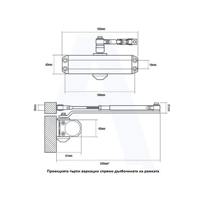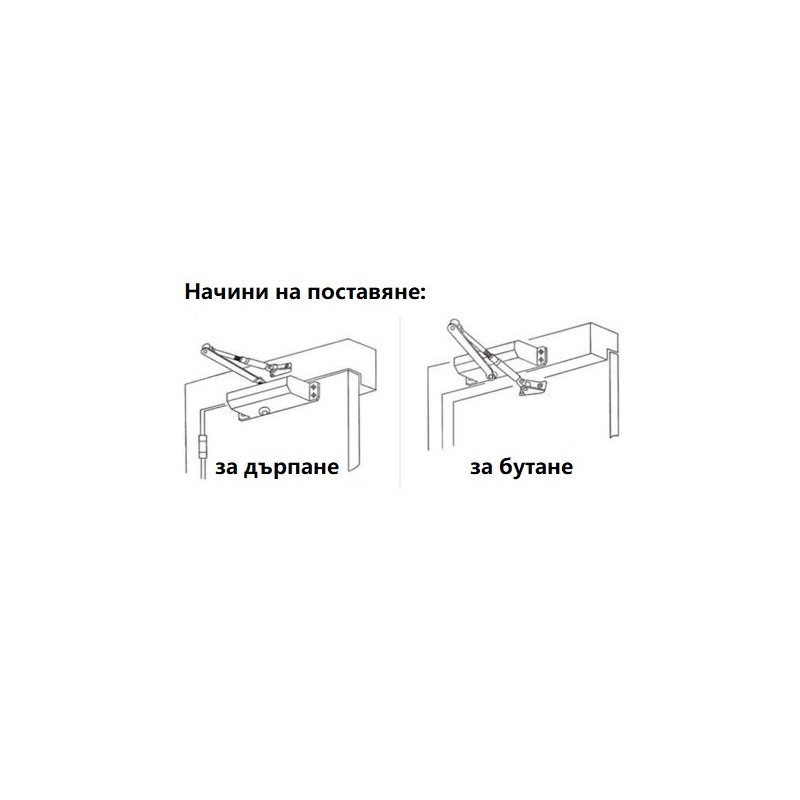 ВАЖНО: Механизмът трябва да се монтирата, така че при затворена врата, прилежащото рамо да е на 90 градуса (перпендикулярно на вратата и моноблока).