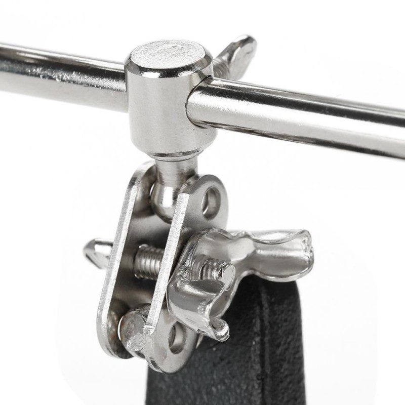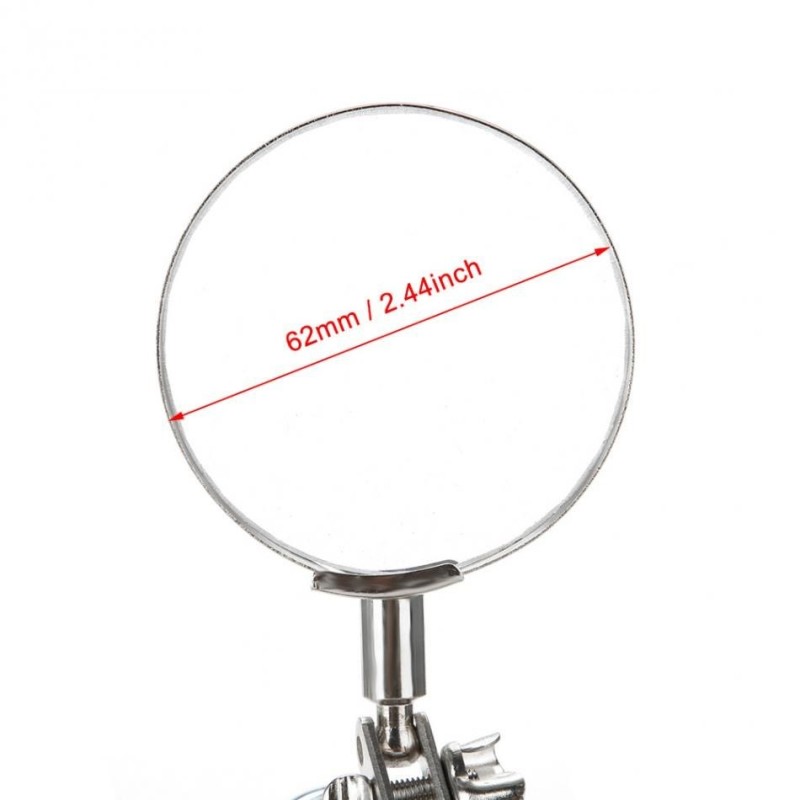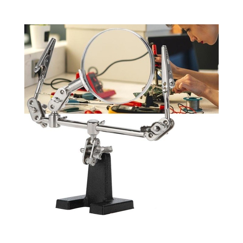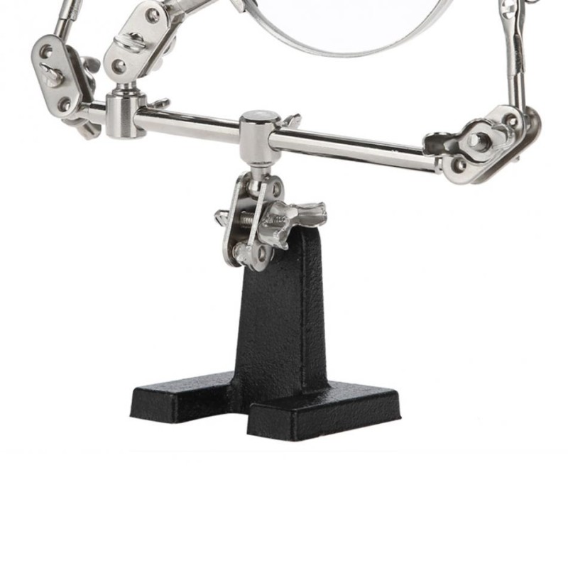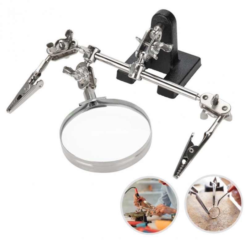 Настолна лупа с диаметър 6 см - подходяща за запояване, ремонтиране и работа с малки елементи, които се захващат посредством две метални щипки. Разстоянието между щипките може да се променя по хоризонтална ос, което позволява да се работи върху елементи с различни размери. Връзката между лупата със стойката позволява лещата да се завърта до желаната позиция. Височината на лупата, както и на рамките с щипките, могат да се променят с винтове. По този начин се постига различно увеличение и оптимално разстояние, необходимо за работа. Връзката межу оста с щипките и стойката позволяват въртене на обработвания обект, което осигурява максимално удобство при работа.