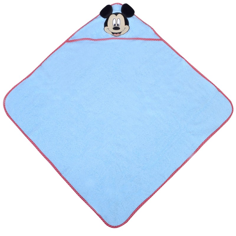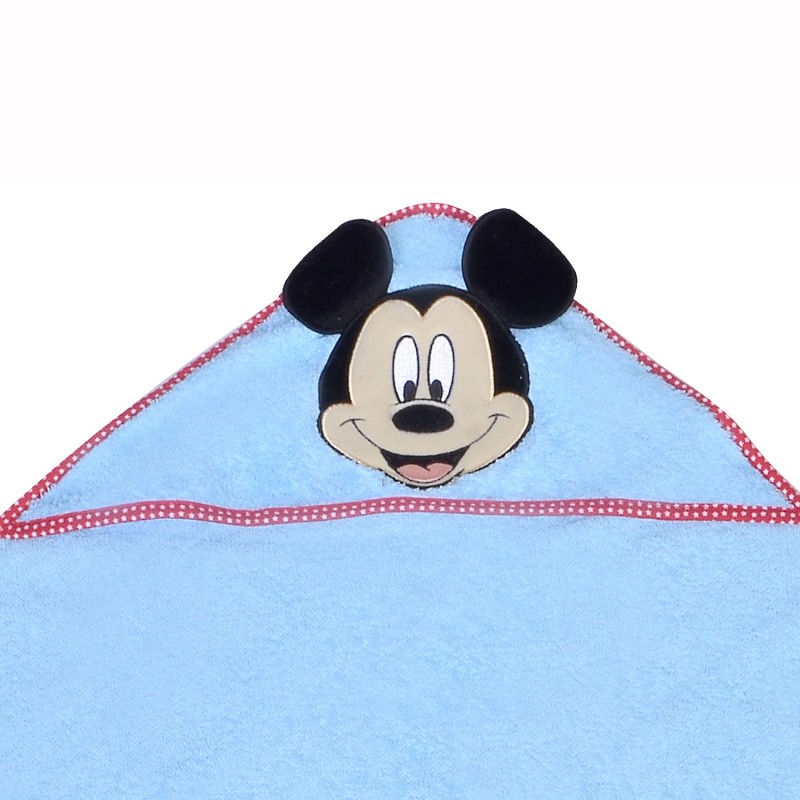 Детска хавлия за баня - тип пончо с качулка, изработена от висококачествен памук в син цвят с апликация на любимия анимационен герой на всяко дете - Мики Маус.