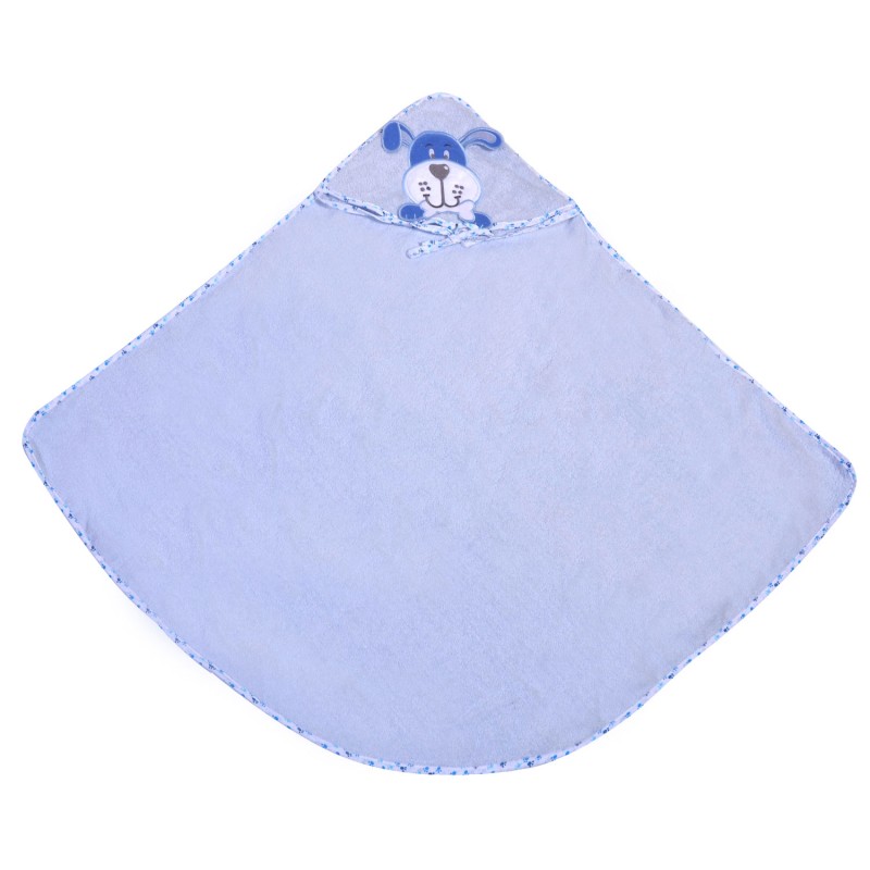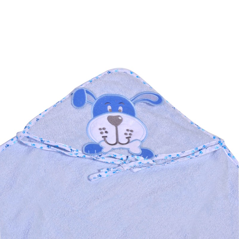 Детска хавлия за баня - тип пончо с качулка, изработена от висококачествен памук в светло син цвят с весела апликация на кученце.