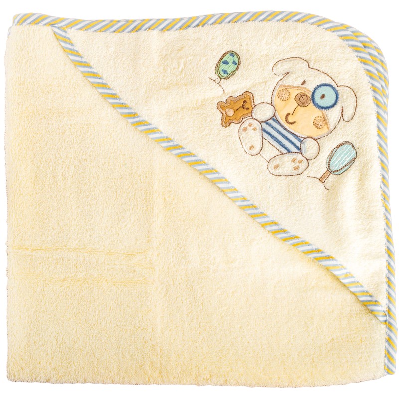 Детска хавлия за баня - тип пончо с качулка, изработена от висококачествен памук в цвят екрю с весела апликация на кученце.
