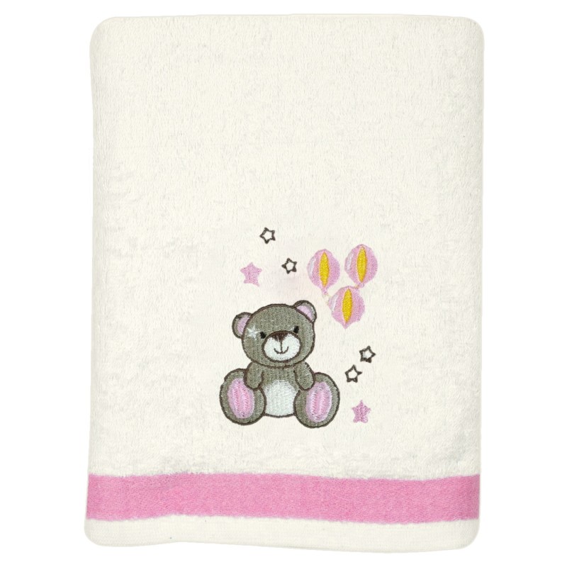 Бебешка хавлиена кърпа за баня, изработена от висококачествен памук в бял цвят с апликация на мече.