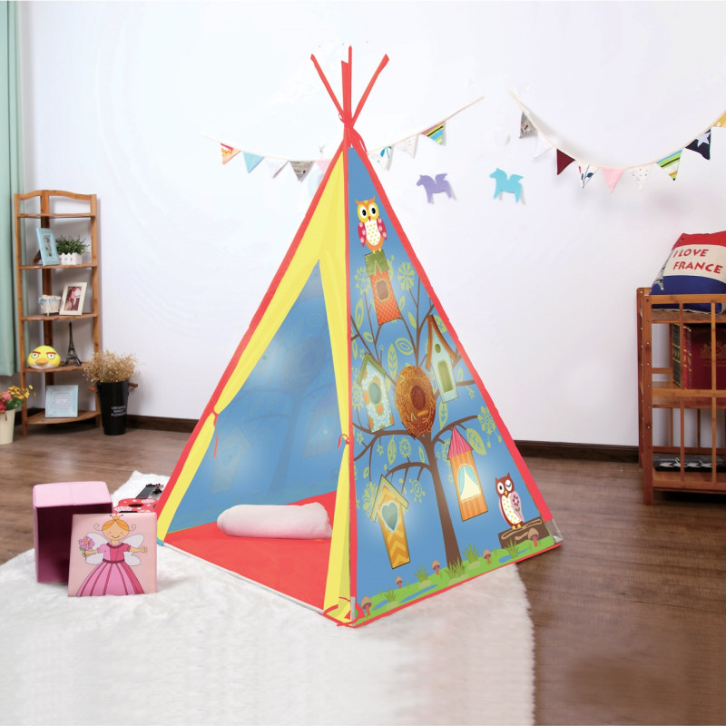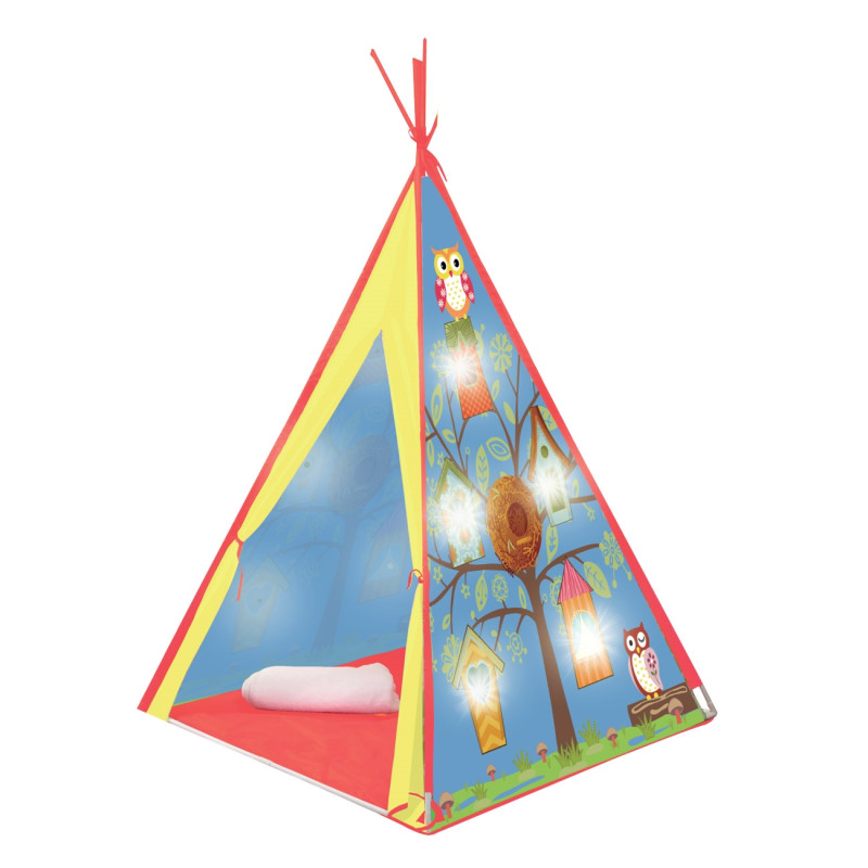 Детска къщичка за игра Индианска палатка с отвор отпред и нарисувани сови с къщички на дърво с вградени 10 LED крушки.