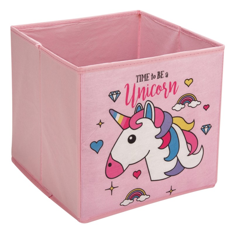 Кутия за съхранение на дрехи, изработена от полиестер в розов цвят с картинка на еднорог.