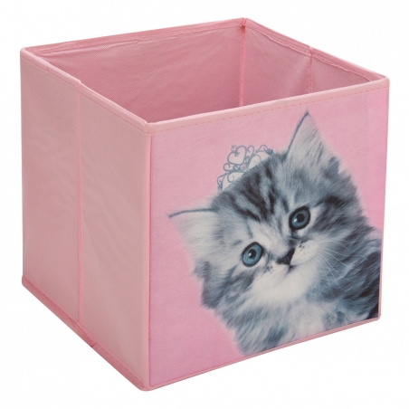 Кутия за съхранение дрехи, изработена от полиестер в розов цвят с щампа на котка с корона отпред.