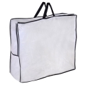 Просторна чанта за съхранение на дрехи и завивки, изработена от полупрозрачна пластмаса с черни кантове, здрави вътрешни шевове и удобни дръжки за лесно носене и транспортиране.