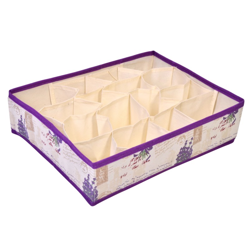 Кутия за съхранение на дрехи, изработена от полипропилен в бял цвят с лилави кантове и винтидж принт на лавандулови стръкове.
