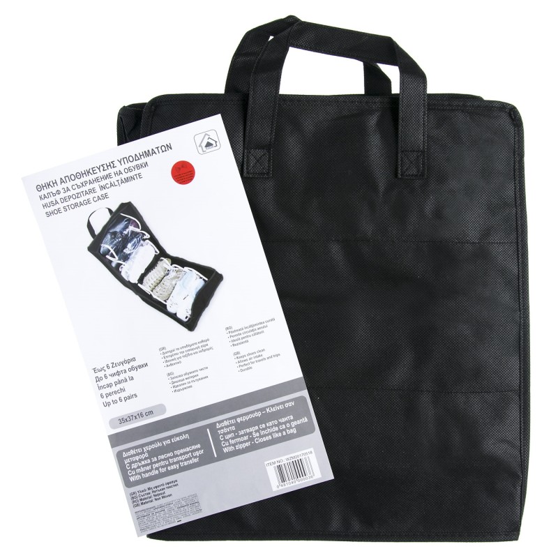 Практичен калъф за съхранение на обувки, изработен от текстил в черен цвят.