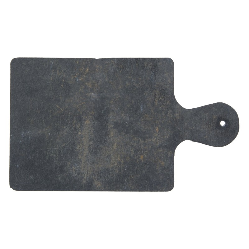 Каменна плоча за сервиране, изработена от обработена естествена скала - шисти в цвят на вулканичен камък с удобна дръжка за лесен захват.