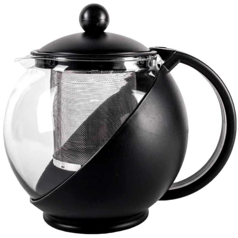 Голяма кана за чай, изработена от висококачествени материали - стъкло и пластмаса в черен цвят с вградена цедка.