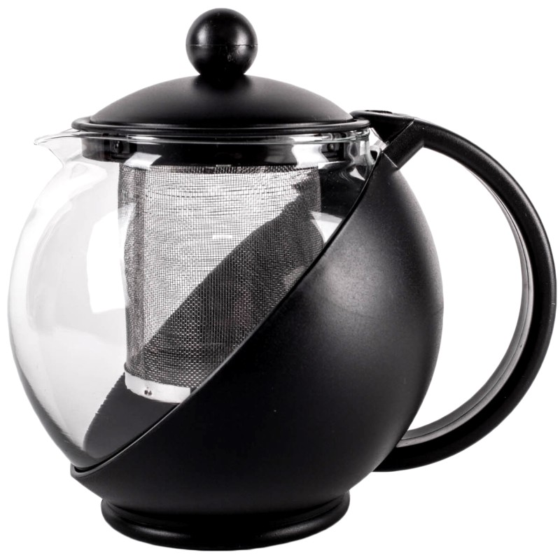 Класическа кана за чай, изработена от висококачествени материали - стъкло и пластмаса в черен цвят с вградена цедка.