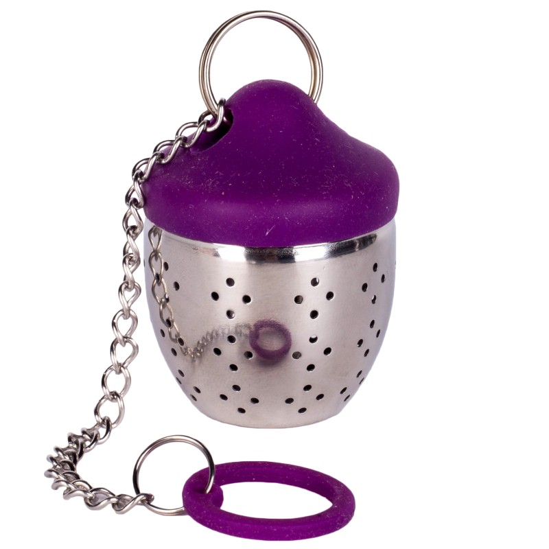 Метална цедка тип кошничка за насипен чай, изработена от неръждаема стомана в сребист с лилави елементи и практична верижка.