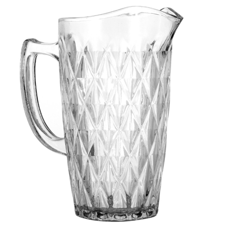 Кана, изработена от качествено прозрачно стъкло с красиви ромбоидни шарки и практичен отвор за лесно сипване без разливане.