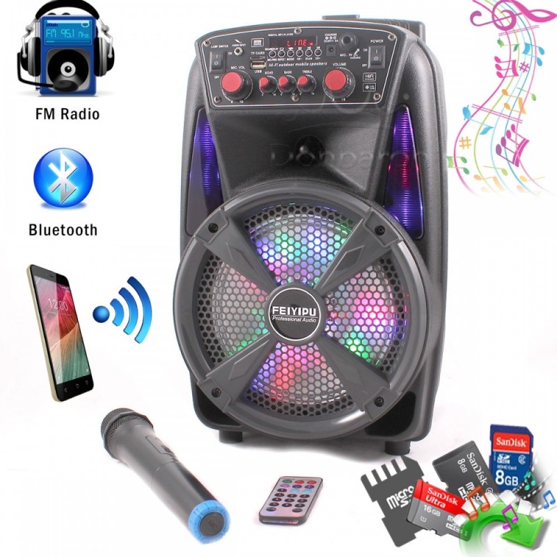 Feiyipu ES-86 Активна тонколона с LED светлини, безжичен микрофон и дистанцонно, 8", 300W, Bluetooth, FM Radio, SD cards