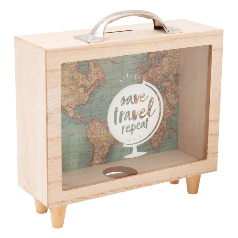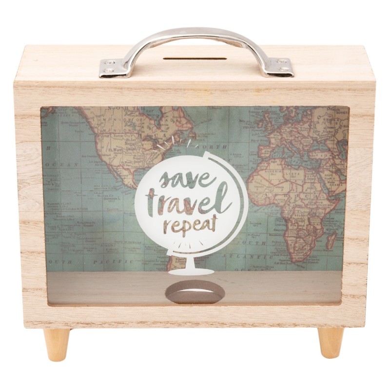 Детска спестовна касичка, изработена от дърво във формата на туристически куфар с карта на света, стъклено прозорче и отвор за пускане на монетите в горната част.