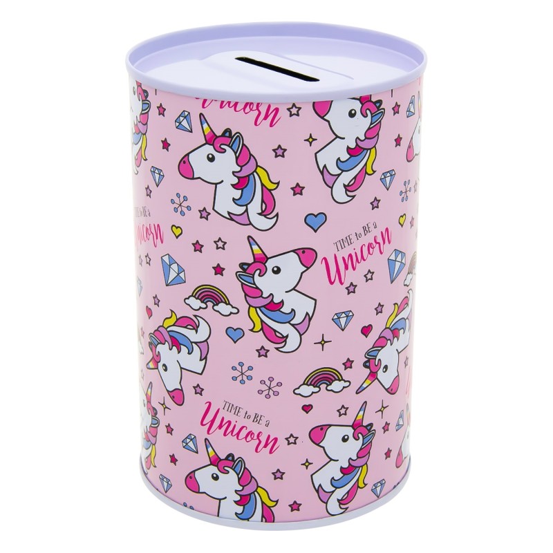 Детска метална спестовна касичка в цилиндрична форма в розов цвят за момиченца с картинка на еднорози и отвор за пускане на монетите в горната част.