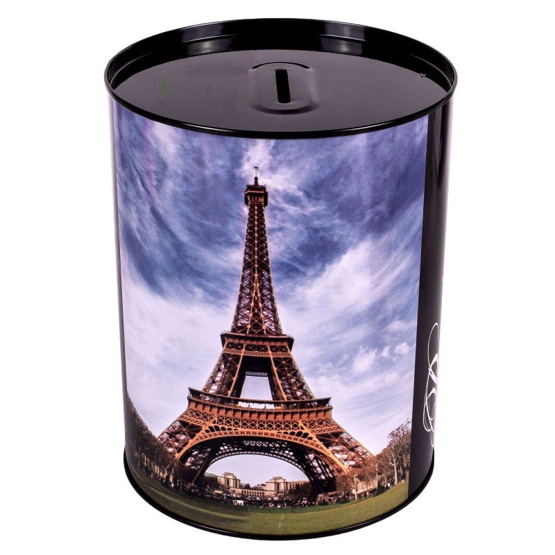 Детска метална спестовна касичка в цилиндрична форма с изображение на Айфеловата кула и отвор за пускане на монетите в горната част.