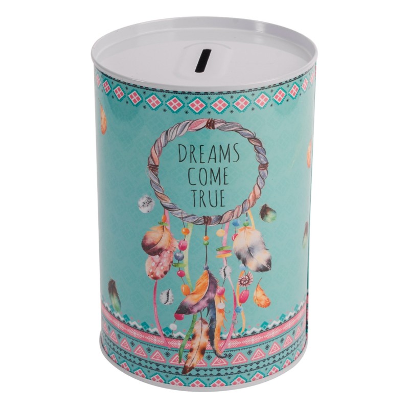 Детска метална спестовна касичка в цилиндрична форма с картинка на индиански амулет Ловец на сънища, надпис DREAMS COME TRUE и отвор за пускане на монетите в горната част.