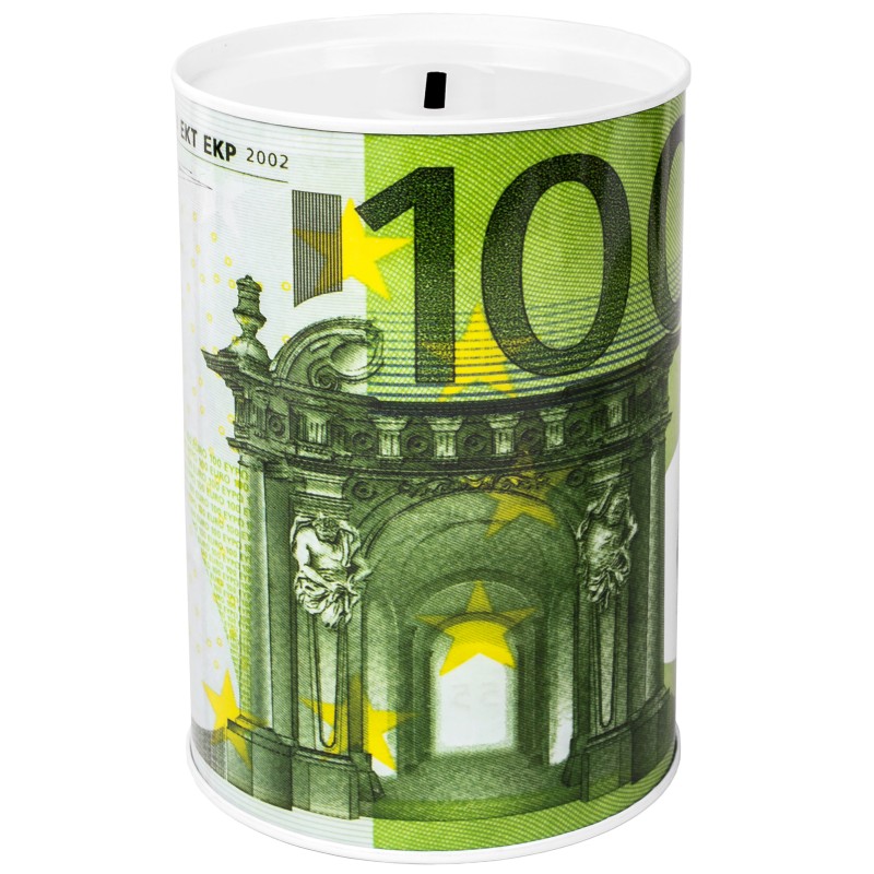 Детска метална спестовна касичка в цилиндрична форма с щампа на банкнота от 100 евро и отвор за пускане на монетите в горната част.