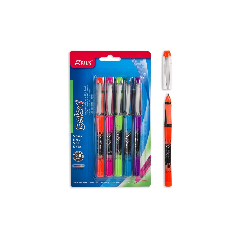 Комплект от 5 броя непрозрачни химикалки с капачки и гел мастило във флуоресцентни цветове - оранжев, цикламен, светло зелен, светло син и лилав за плътни и непрекъснати линии върху хартиена повърхност.