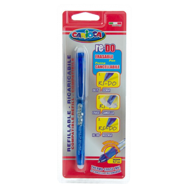 Синя химикалка CARIOCA с изтриваемо мастило, ергономична дръжка и предпазна капачка с гума за изтриване. За гладко и прецизно писане върху всякакъв вид хартия. Възможност за многократно пълнене.