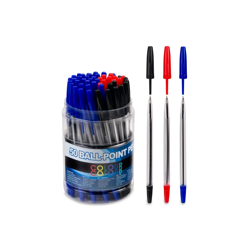 Голяма икономична опаковка от 50 броя класически прозрачни химикалки с предпазни капачки за писане върху всякакъв вид хартия - 30 сини, 10 черни и 10 червени в практична кутия с капак за лесно и удобно съхранение.