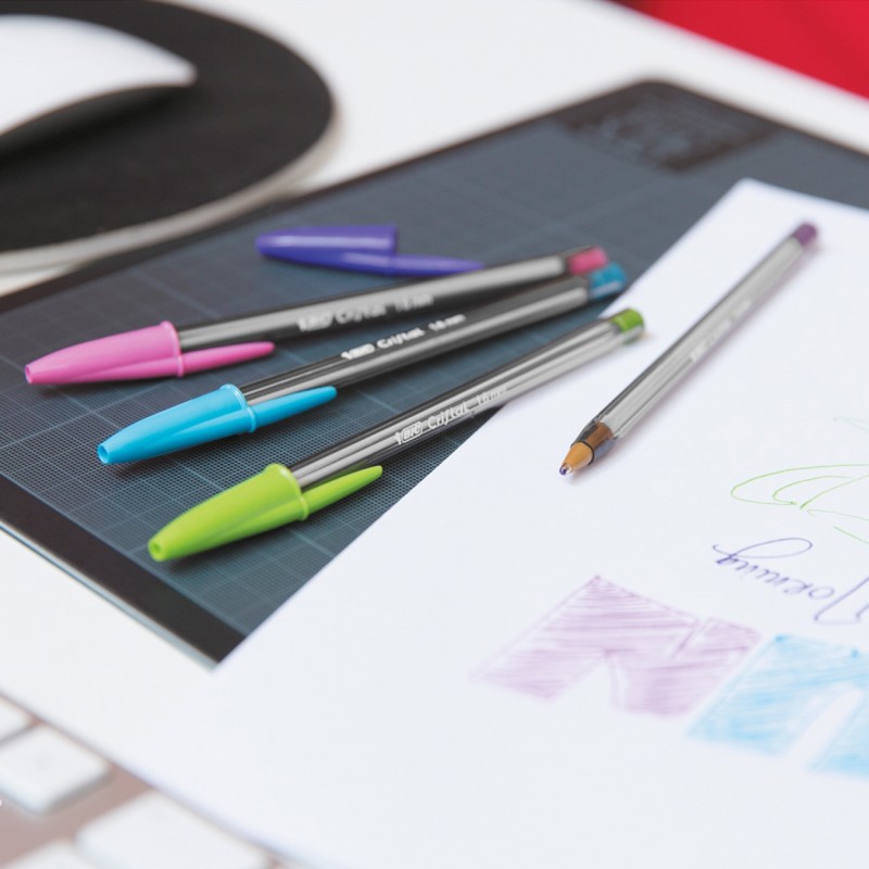 Комплект от 4 броя прозрачни разноцветни химикалки BIC cristal fun с капачки за писане върху всякакъв вид хартия - 1 светло синя, 1 лилава, 1 розова и 1 светло зелена.