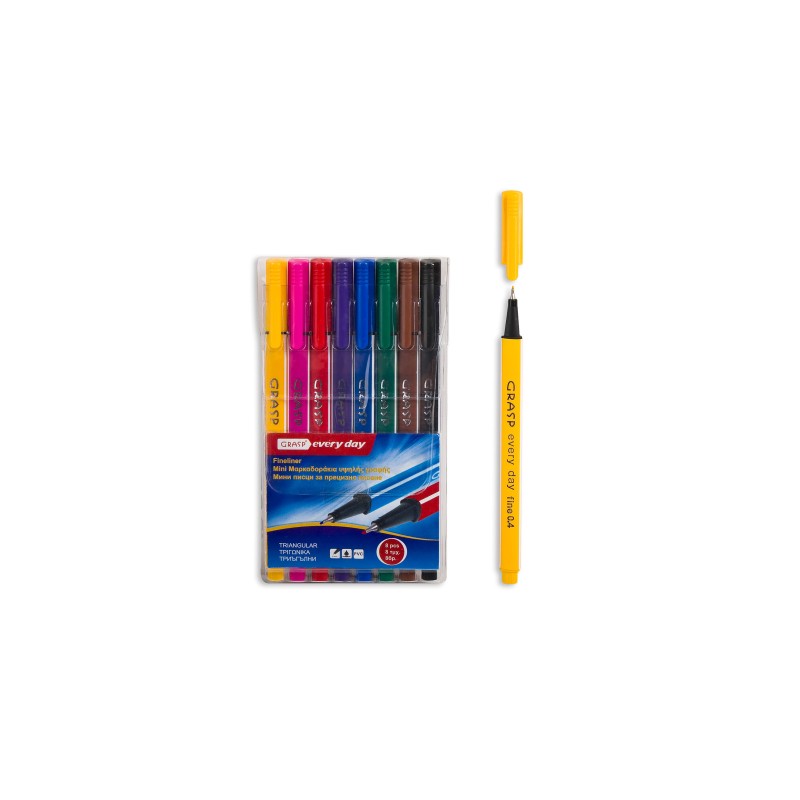 Комплект от 8 броя мини тънкописци в триъгълна форма с предпазна капачка в различни цветове - черен, кафяв, зелен, син, лилав, червен, розов и жълт за писане, оцветяване или подчертаване върху всякакъв вид хартия.