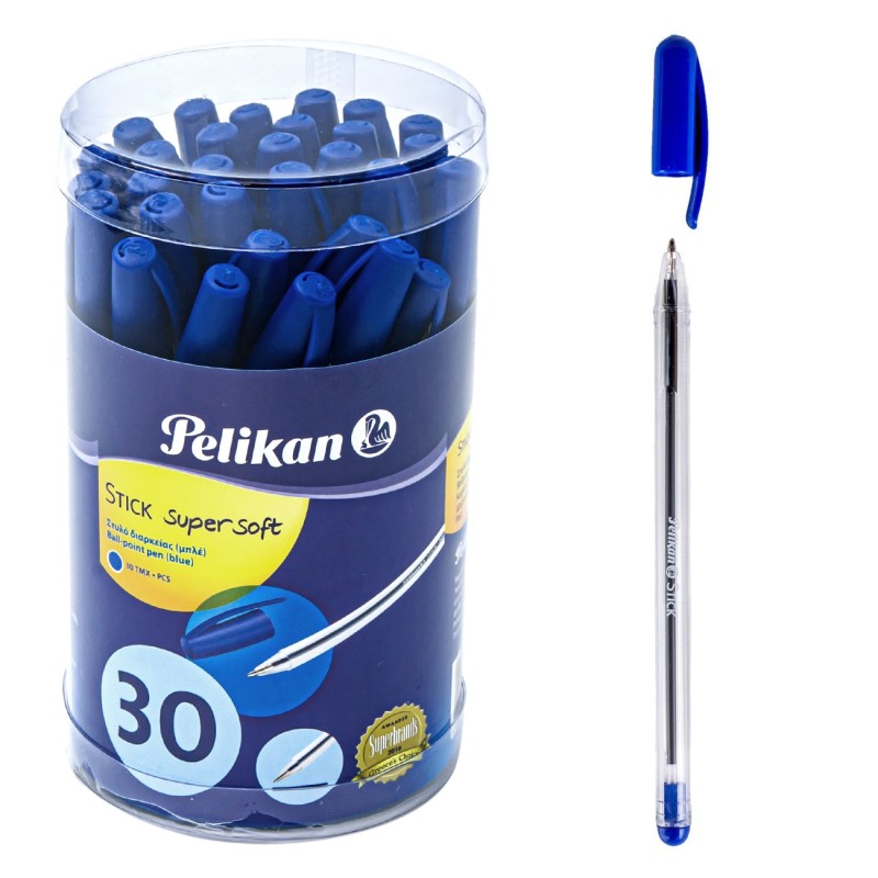 Икономична опаковка от 30 броя класически сини химикалки PELIKAN с капачки за писане върху всякакъв вид хартия в удобна пластмасова кутия с капак за лесно съхранение.