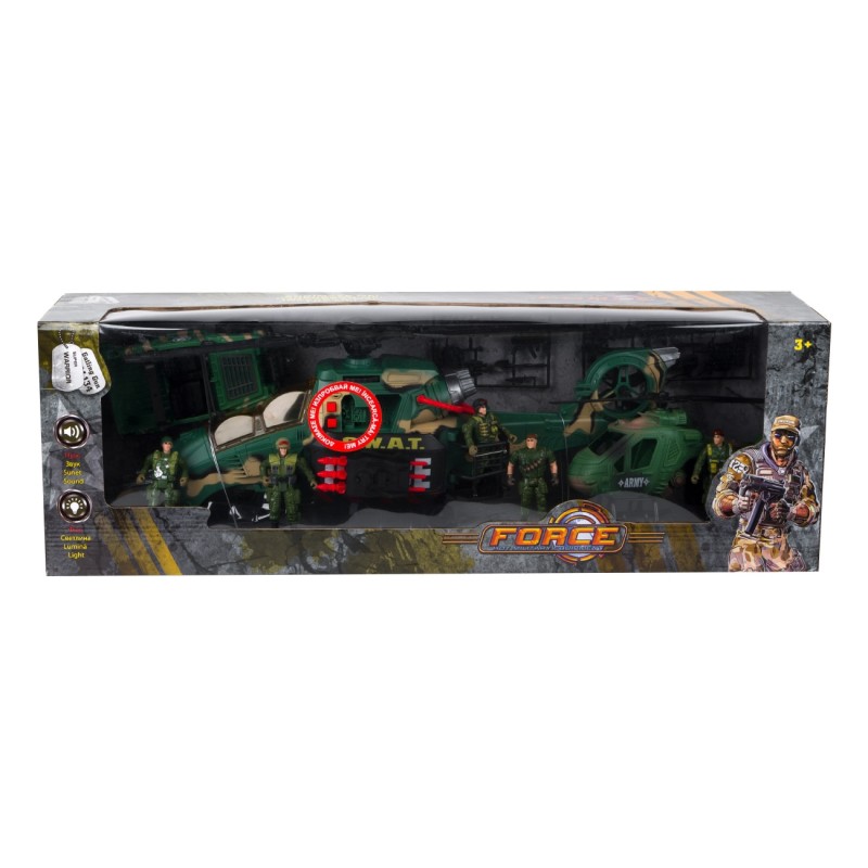 Детски комплект, включващ военен хеликоптер на специален отряд S.W.A.T. в маскировъчен зелен цвят с реалистични звуци + малък хеликоптер, военен джип, фигурки на войници и различни аксесоари за битка.