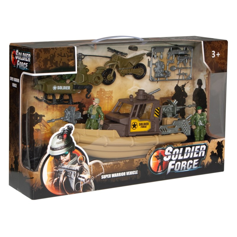 Детски комплект, включващ военен кораб в кафяв цвят с хеликоптер и мотоциклет + фигурки на войници с различни оръжия, изработени от качествена и безвредна пластмаса.