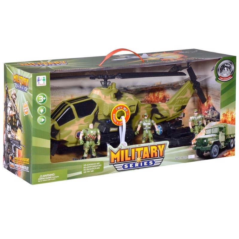 Детска играчка военен хеликоптер в маскировъчни цветове, изработена от плътна и здрава пластмаса със светлинни и звукови ефекти + 3 фигурки на войници и различни аксесоари.