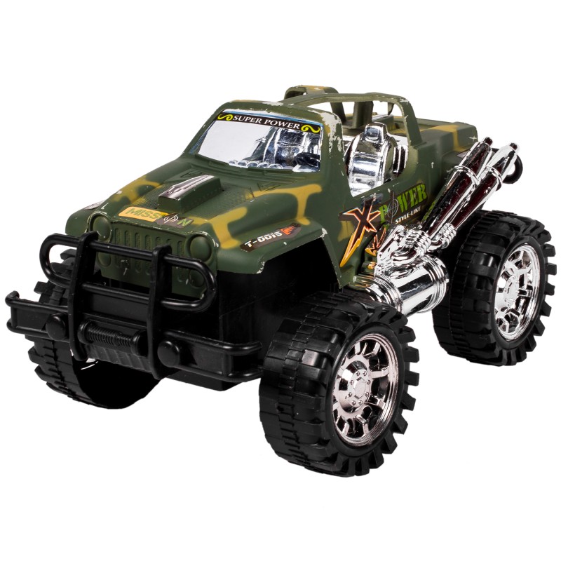Детска играчка военен джип в маскировъчни цветове с големи ауспуси, изработен от здрава и устойчива пластмаса с механизъм за навиване.