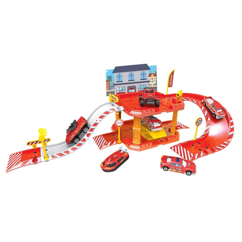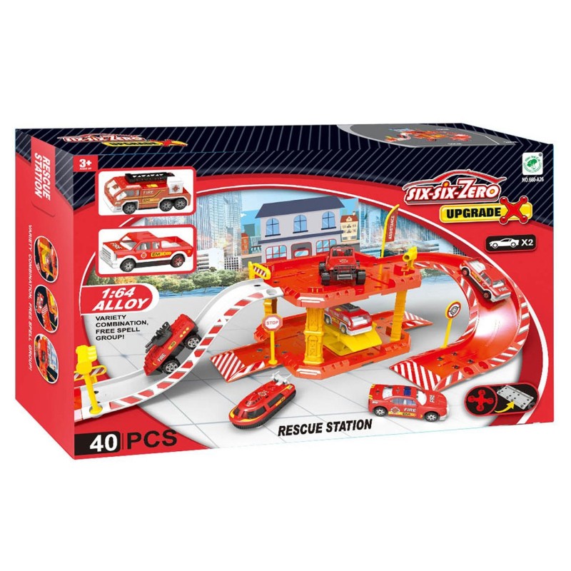 Увлекателен детски комплект - пожарникарски гараж на 2 нива от 40 части с 2 автомобила.