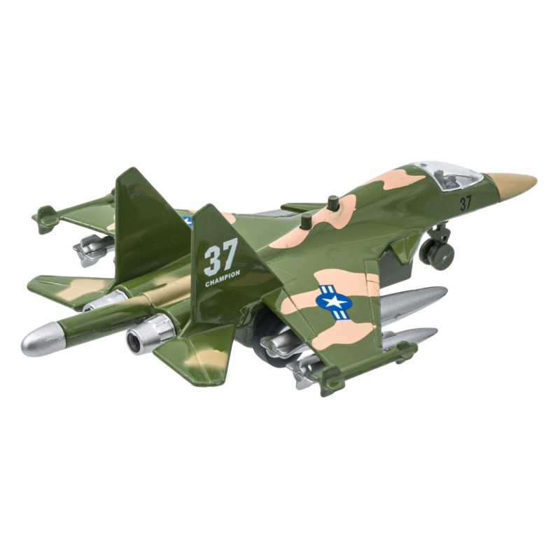 Детска играчка военен самолет в маскировъчни цветове, изработена от пластмаса и метал със звук и светлини.