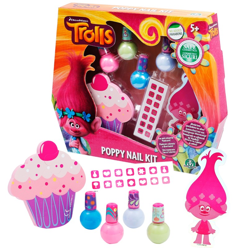 Детски комплект за лакиране на нокти TROLLS, включващ 4 различни цвята лак за нокти, разделител за пръстите на краката във формата на мъфин и стикери.