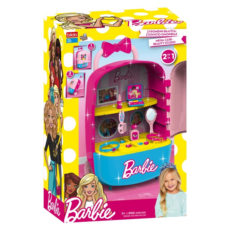 Куфар с дръжка и колелца BARBIE, съдържащ различни фризьорски аксесоари, изработен от качествени материали в ярки цветове.