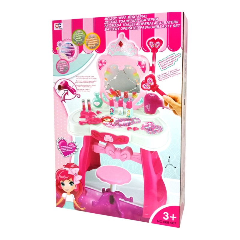 Разполага с чекмедже за бижута и 16 различни аксесоара - бижута, парфюми, гребени, четки, лакове, гримове + сешоар и вълшебна пръчица.